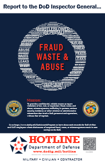 If you need to report fraud, waste, abuse, a security concern, violations of law, policy violations, or other matter of concern related to the Department of Defense (DoD), please find information below that will help you. The DoD IG recommends to contact the affected service's inspector general first, when appropriate.